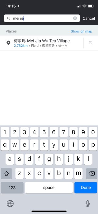 ทีนี้มาลองค้นหาสถานที่ปลายทางที่ต้องการไปเป็นภาษาอังกฤษดู ในรูปเราลองพิมพ์แค่ “mei jia” ระบบก็ค้นหาสถานที่ได้ถูกต้อง ซึ่งก็คือไร่ชาหลงจิ่งที่เราอยากไปนั่นเอง
