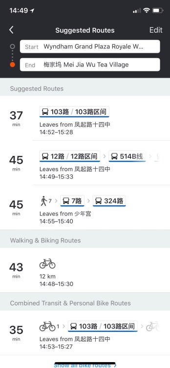 แอพจะค้นหาวิธีการเดินทางที่ดีที่สุด และเร็วที่สุดมาให้ ในนี้แสดงการเดินทางด้วยรถบัส หรือจักรยานมาให้ (สามารถเลือก option เพิ่มได้ ถ้าต้องการการเดินทางแบบอื่น)
