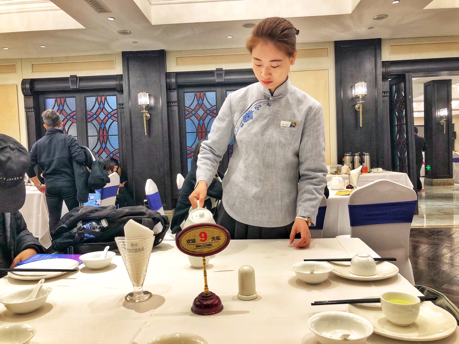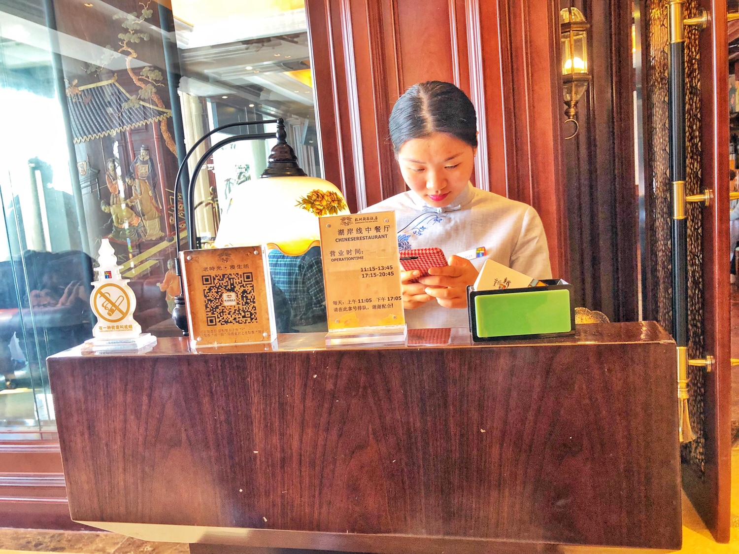 พนักงานรอต้อนรับที่เคาน์เตอร์พอเห็นพวกเราก็รีบกดมือถือส่งแปลภาษาอังกฤษมาทันทีว่าโต๊ะเต็มหมดแล้ว แต่จะพาไปอีกห้องหนึ่งของโรงแรมที่ยังมีโต๊ะว่างอยู่ ในตอนนั้นทุกคนคิดว่า โห อะไรจะขนาดน้าน ร้านนี้มันต้องอร่อยแน่ ๆ