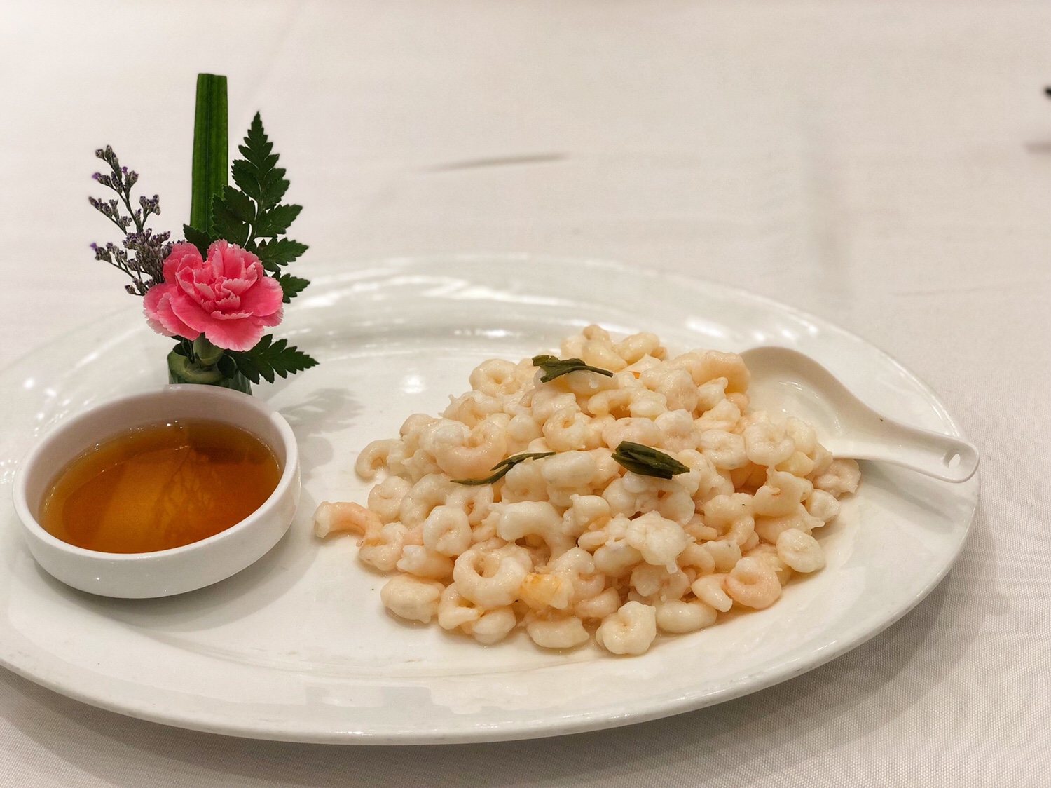 อาหารจานแรกเข้ามาเสริฟ กุ้งผัดพร้อมน้ำจิ้มจิ๊กโฉ่ ตัวกุ้งเด้งๆ ดึ๋งดั๋ง แต่รสชาติจืดสนิทสไตล์อาหารจีนแท้