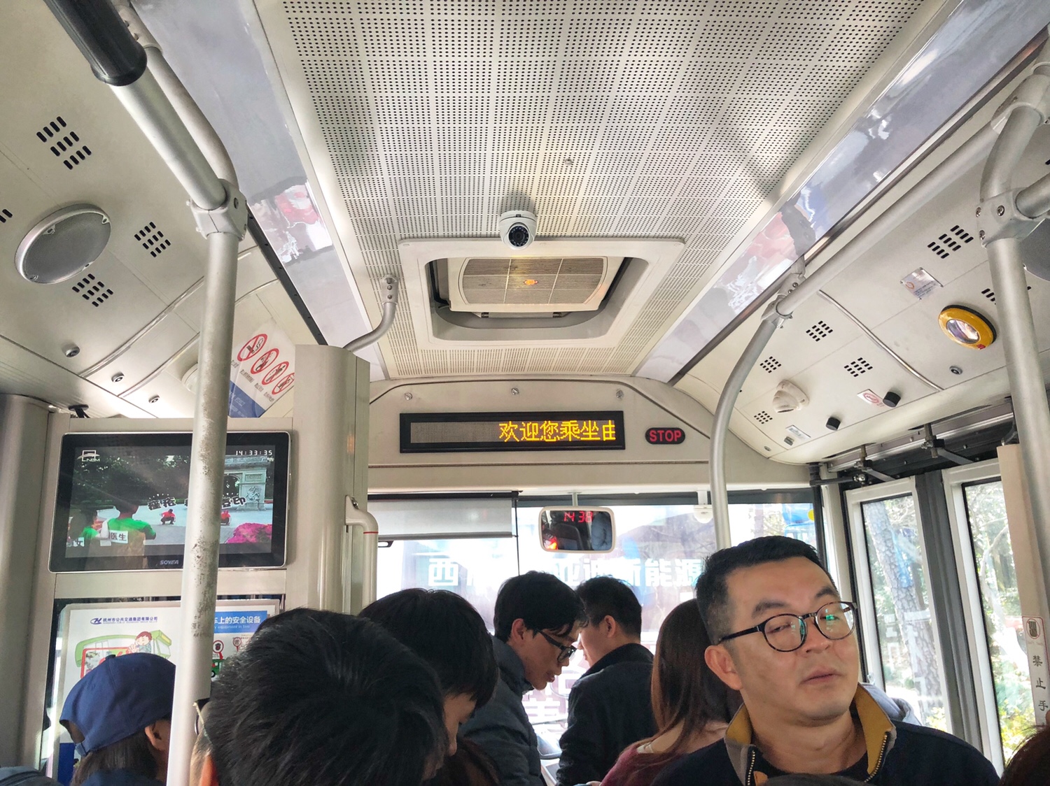 รถเมล์สาย 7 นี้แหละที่พอค้นหาใน Google Map แล้วบอกว่าไปได้ เห็นมีคนรอขึ้นรถเมล์จากด้านหลังเราก็เดินตามขึ้นไปบ้าง จากนั้นก็เดินไปจ่ายเงินที่คนขับคนละ 3 หยวน ในรถมีป้ายที่จอดบอกไว้ด้วยแต่ก็มีเฉพาะภาษาจีนเท่านั้น