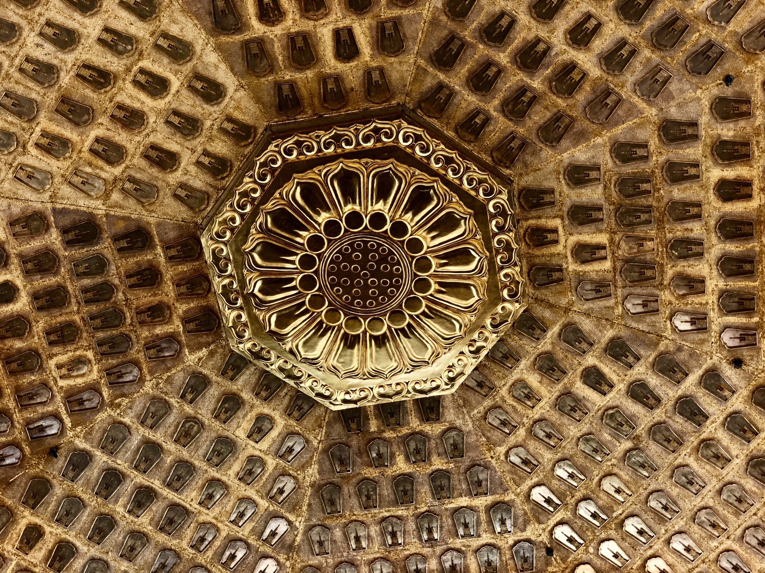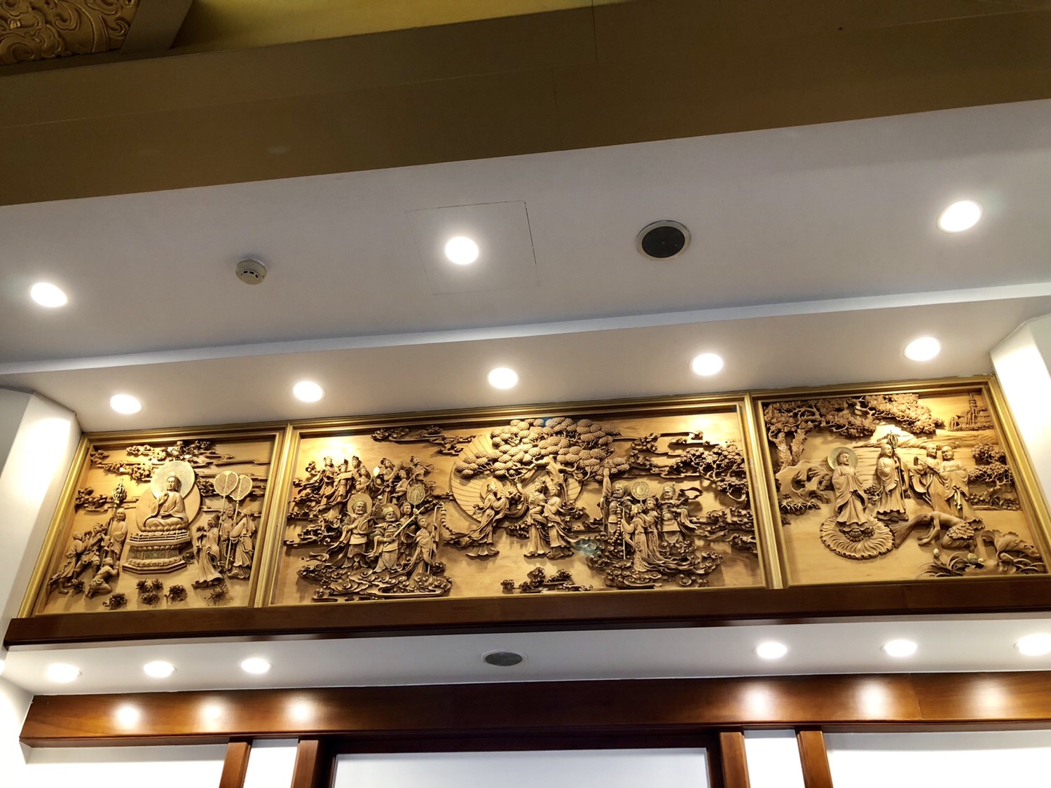 มาถึงข้างบนมองดูเพดานของที่นี่เป็นสีทองอร่าม ตรงกลางสามารถเลื่อนลงมาได้ด้วย