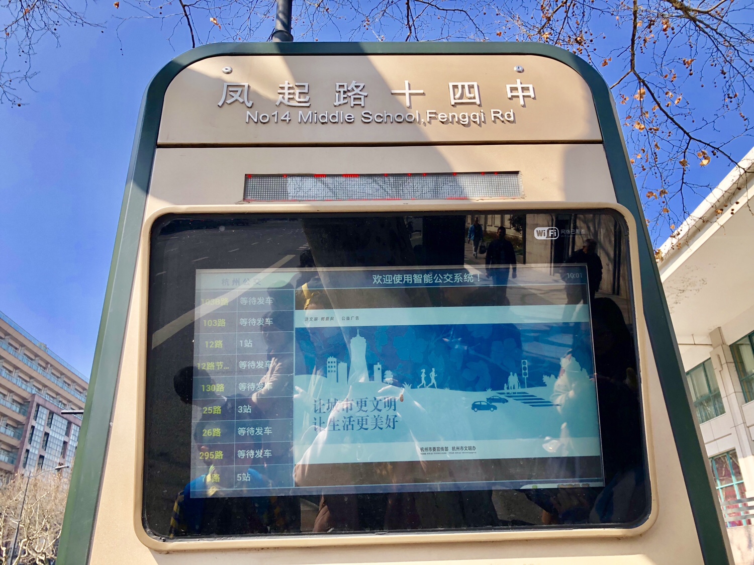 พวกเราออกจากโรงแรม เปิด Google map ให้พาเราเดินมาถึงป้ายรถเมล์ No14 Middle School Fengqi Rd ที่ป้ายจะมีหน้าจอบอกเลยว่ารถเมล์หมายเลขอะไรกำลังจะมาถึง ทันสมัยดีจัง