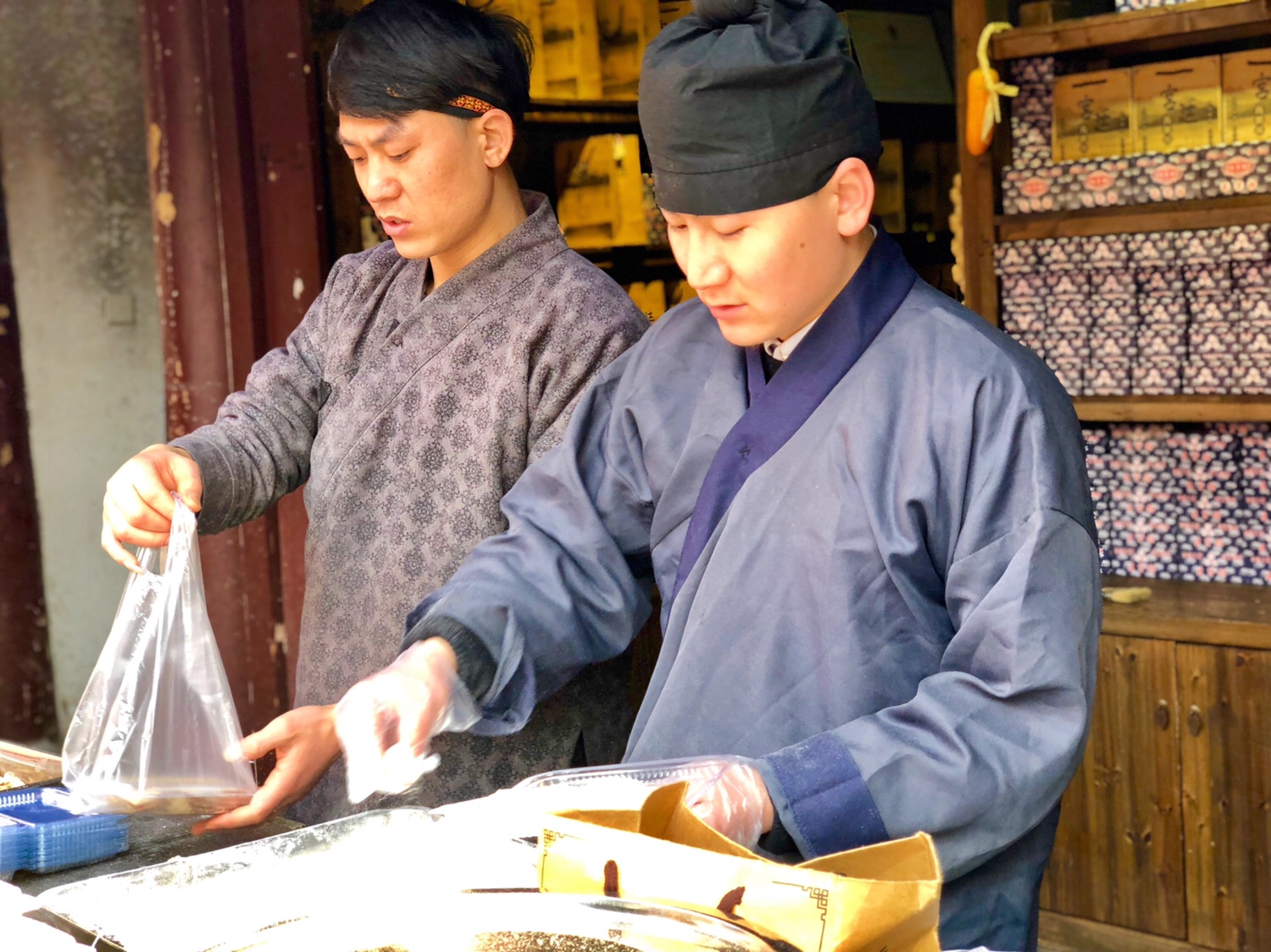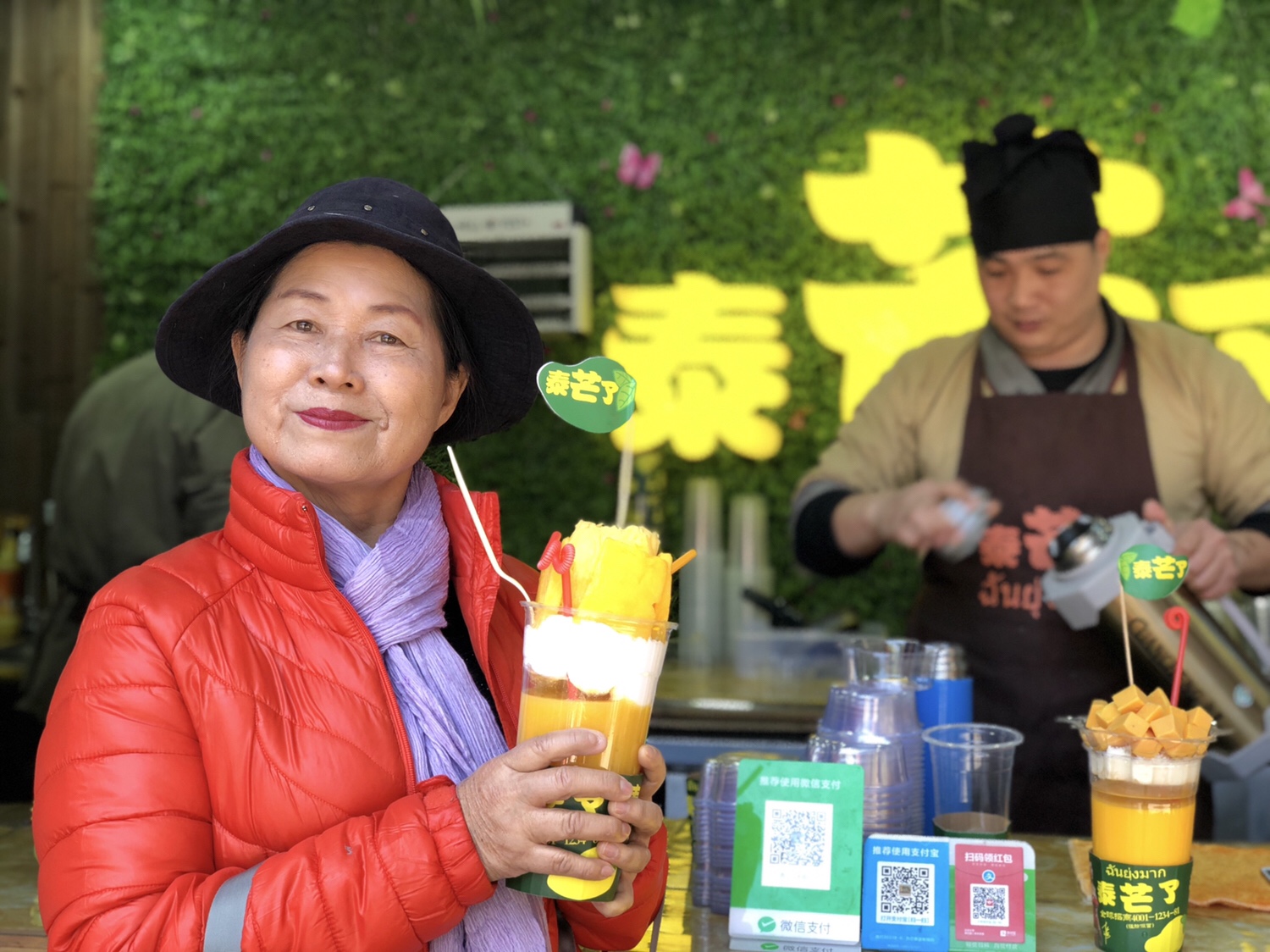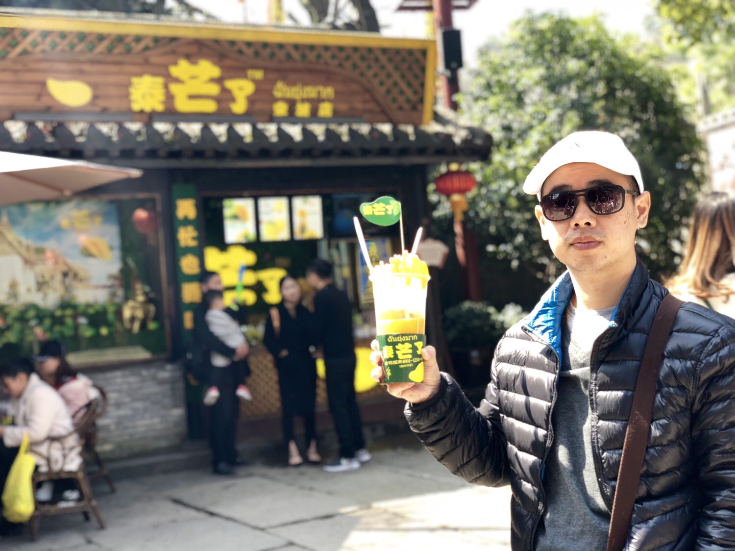 ในขณะที่เรากำลังตรวจสอบเส้นทางบนแผนที่อยู่นั้น พี่ชายและขุ่นแม่ก็พากันไปที่ร้านน้ำมะม่วงหน้าทางเข้ามีชื่อร้านว่า “ฉันยุ่งมาก” ที่มีชื่อนี้เพราะเค้าเล่นคำพ้องเสียง ในภาษาจีน คำว่า “มะม่วง” อ่านว่า “หมางโก่ว” ซึ่งคำว่า “หมาง” หมายความว่า “ยุ่ง” นั่นเอง