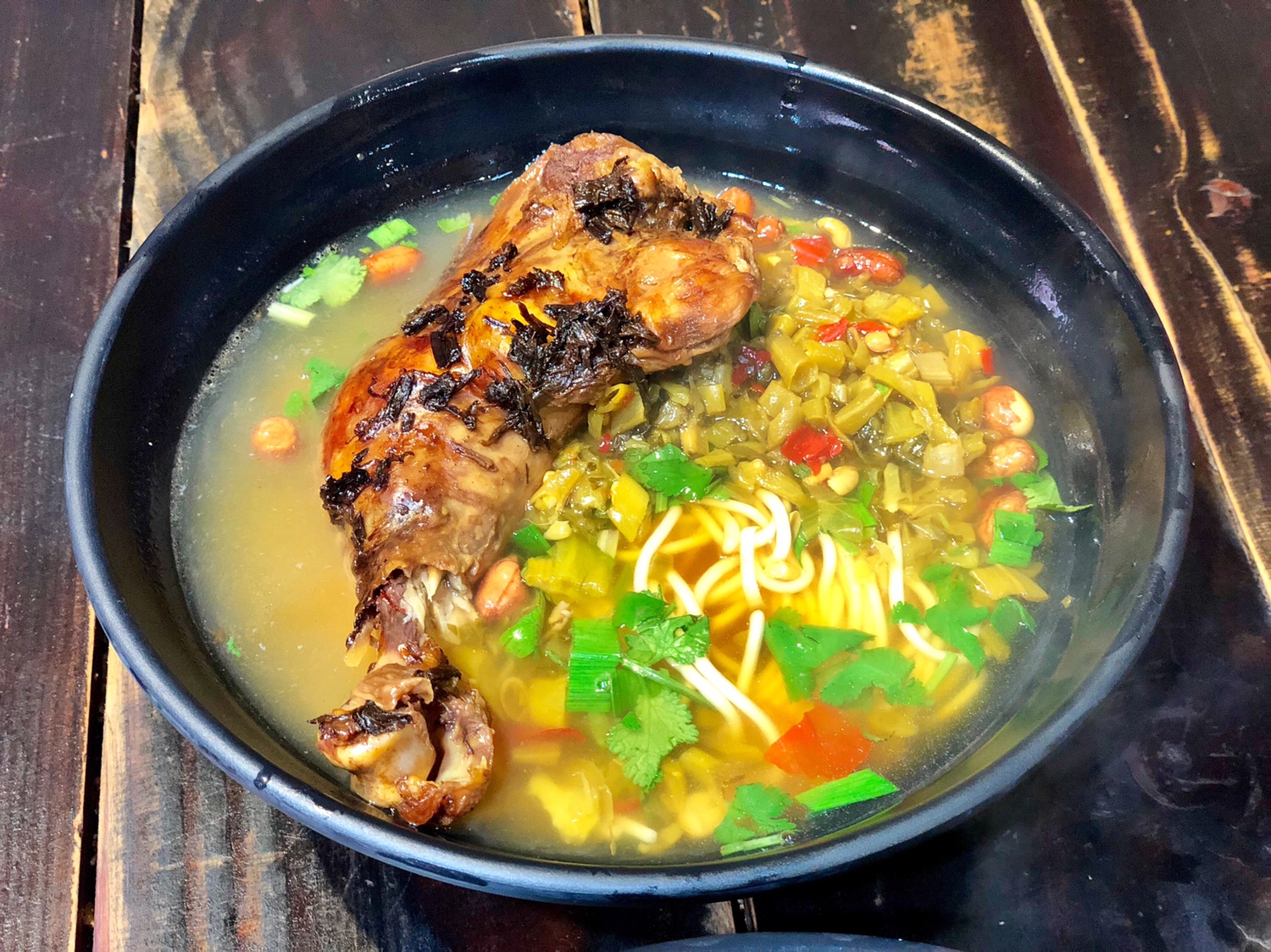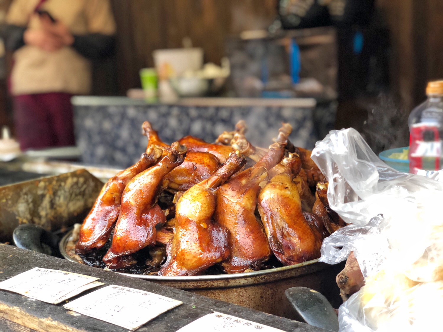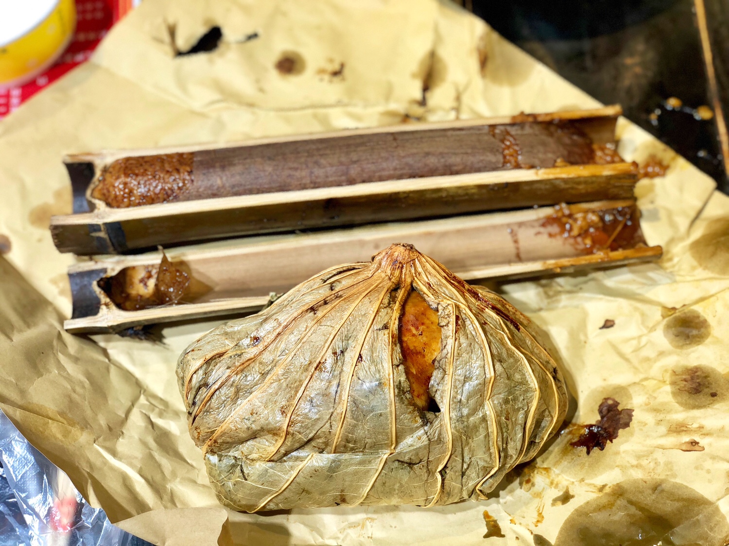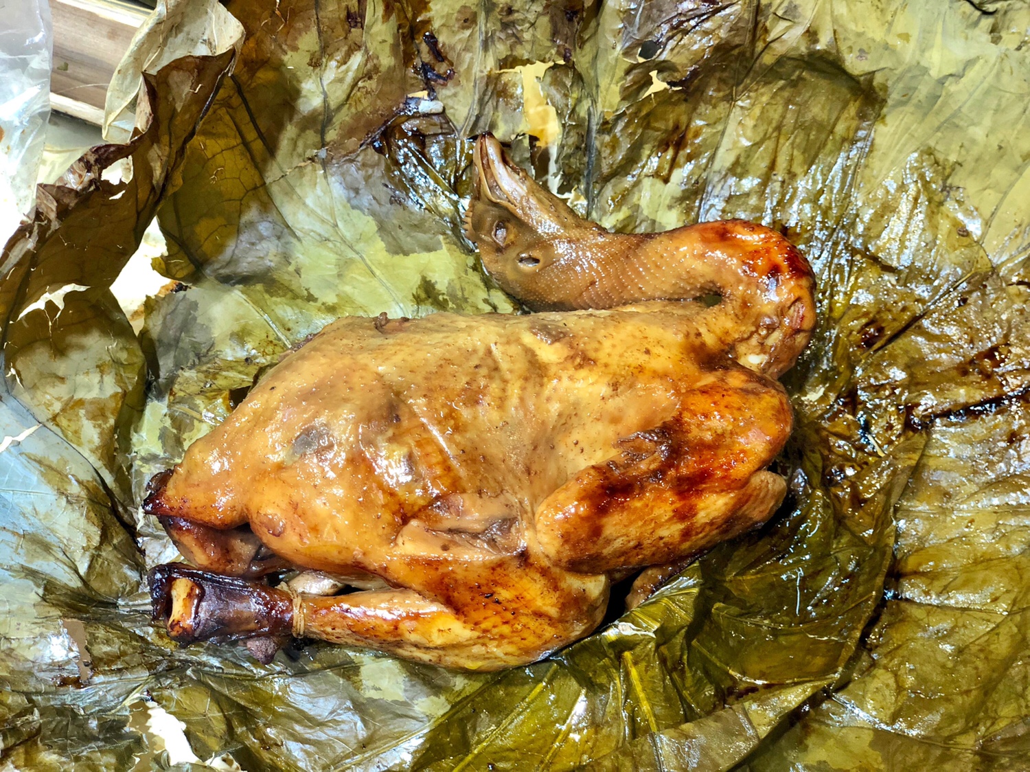 จานสุดท้ายนี้ ไก่ห่อด้วยใบไม้ แนะนำโดยเจ้าของร้านที่เดินมาชี้แล้วบอก “ห่าวซือๆ” (อร่อย ๆ) เราดูแล้วราคาสูงไปสักหน่อย (68 หยวน) แต่ว่า…น้ำย่อยมันเรียกร้อง เลยตอบตกลงทันใด ซึ่งก็ไม่ผิดหวังจริง ๆ เพราะเนื้อนุ่มอร่อยเลย