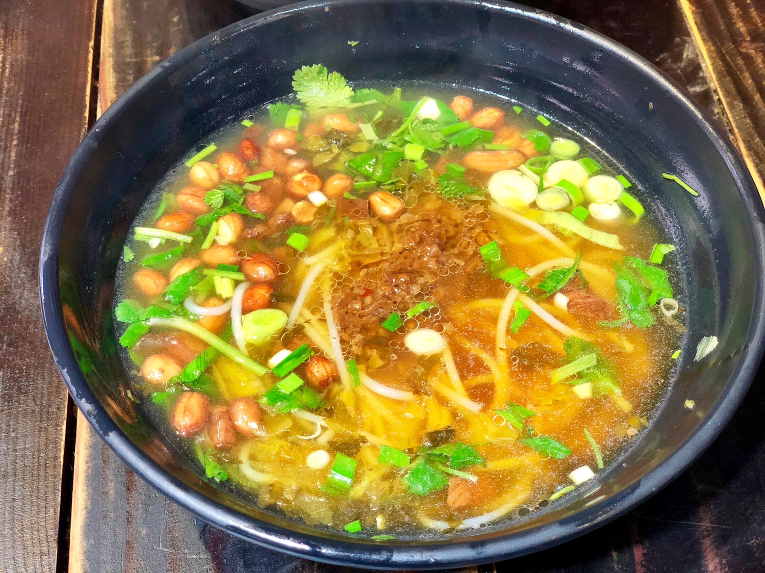 ถัดมาเราชี้ทางขวา นับลงมา 7 บรรทัด บะหมี่โรยถั่วลิสง ถ้วยนี้น้ำซุปรสชาติดีกลมกล่อม เส้นหยุ่นๆ มีเนื้อให้ด้วย