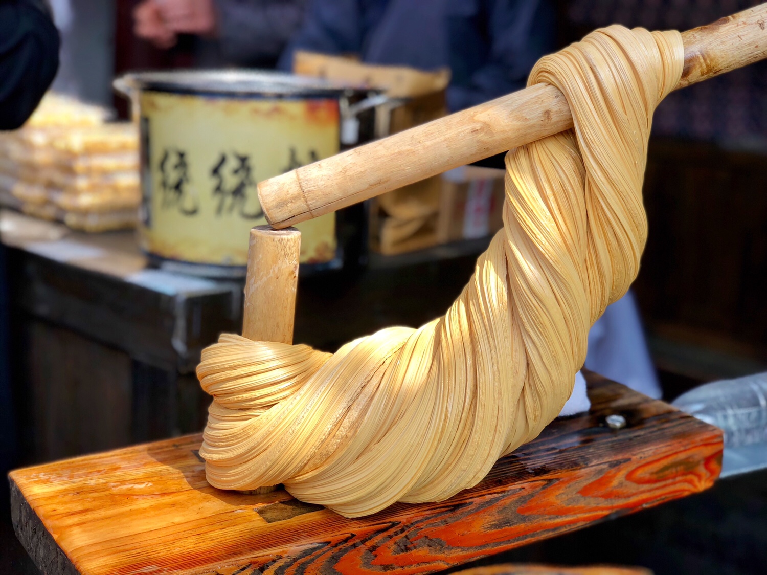 โชว์นู่นนี่มีเยอะแยะ ผู้คนเค้าก็แห่ตามไปดู อันนี้เป็นโชว์ยืดเส้นขนมดูท่าทางจะใช้กำลังมากเพราะหนืดและเหนียวเหลือเกิน