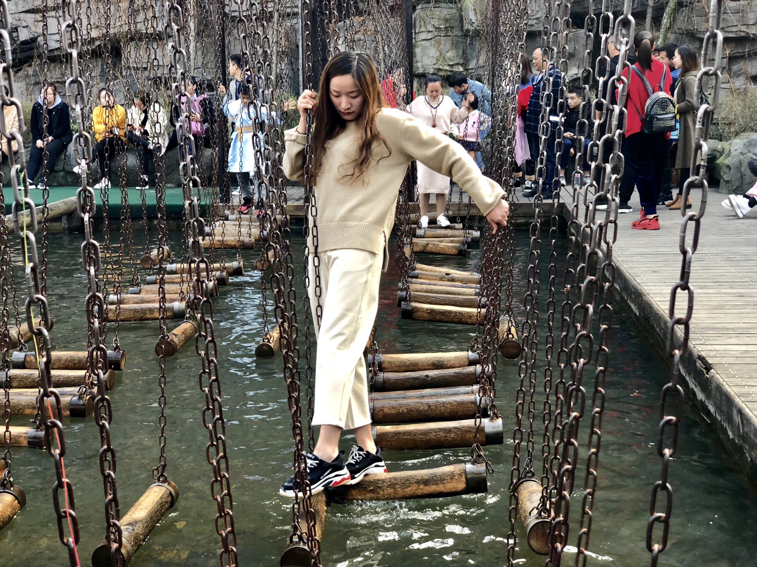ขณะที่สนใจปาท่องโก๋กันอยู่นั้น พวกเราก็ได้ยินเสียงดังมาแต่ไกล นั่นมัน “สถานที่ฝึกวรยุทธ” เรารีบเข้ามาเชียร์ ตรงนี้คงเป็นที่ฝึกการทรงตัว เมื่อก้าวเท้าไปเหยียบไม้อีกท่อนหนึ่ง ตัวเราจะเอนไปมา แต่ใครที่ตกน้ำลงไปไม่ต้องกังวลเรื่องเสื้อผ้าเปียก เพราะด้านข้างนี้เค้ามีเครื่องปั่นผ้าบริการด้วย