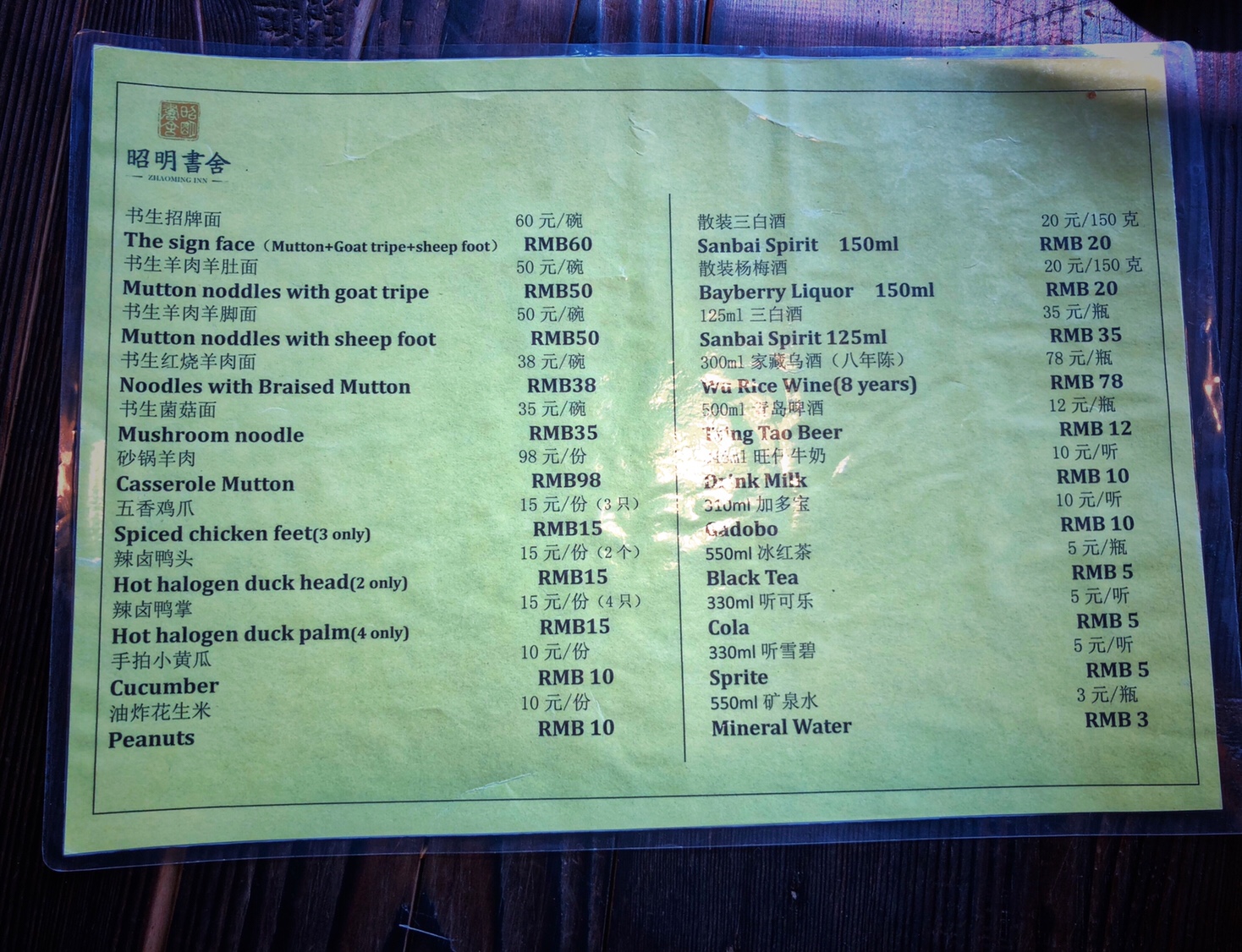 พี่ชายถาม ลองเอามาหน่อยมั้ย ทุกคนรีบตอบ nooo พอเมนูมาถึงพวกเรากำลังจะหยิบ Google Translate ขึ้นมา เวลานั้นคนจีนเจ้าของโรงแรมที่เราเช่าก็เข้ามาและช่วยเลือกเมนูให้ มื้อนี้เราบอกว่าไม่เอาแกะและแพะและกบ ขอเป็นเนื้อหมู เนื้อวัว และเนื้อปลาก็พอ