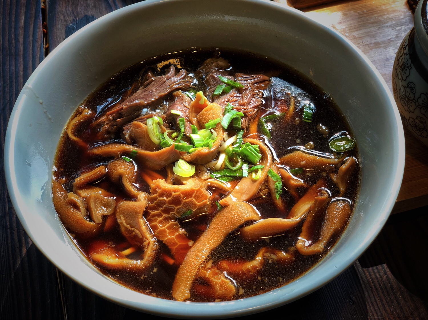 ผักพอหอมปากหอมคอเท่านั้น ซึ่งของอร่อยเด็ด ก็คือเต้าหู้ยาว ๆ กัดเข้าไปแล้วเหนียวนุ่ม เส้นบะหมี่ใหญ่ ๆ ก็อร่อย