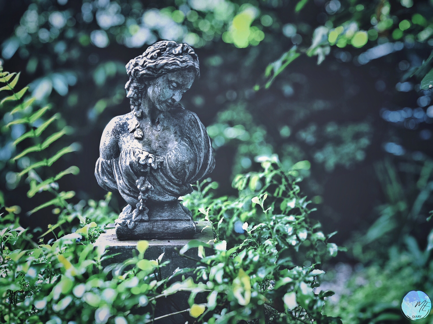 มีรูปปั้นขึ้นตะไคร่ร้วมรอบต้นไม้ใบหญ้าสีเขียว