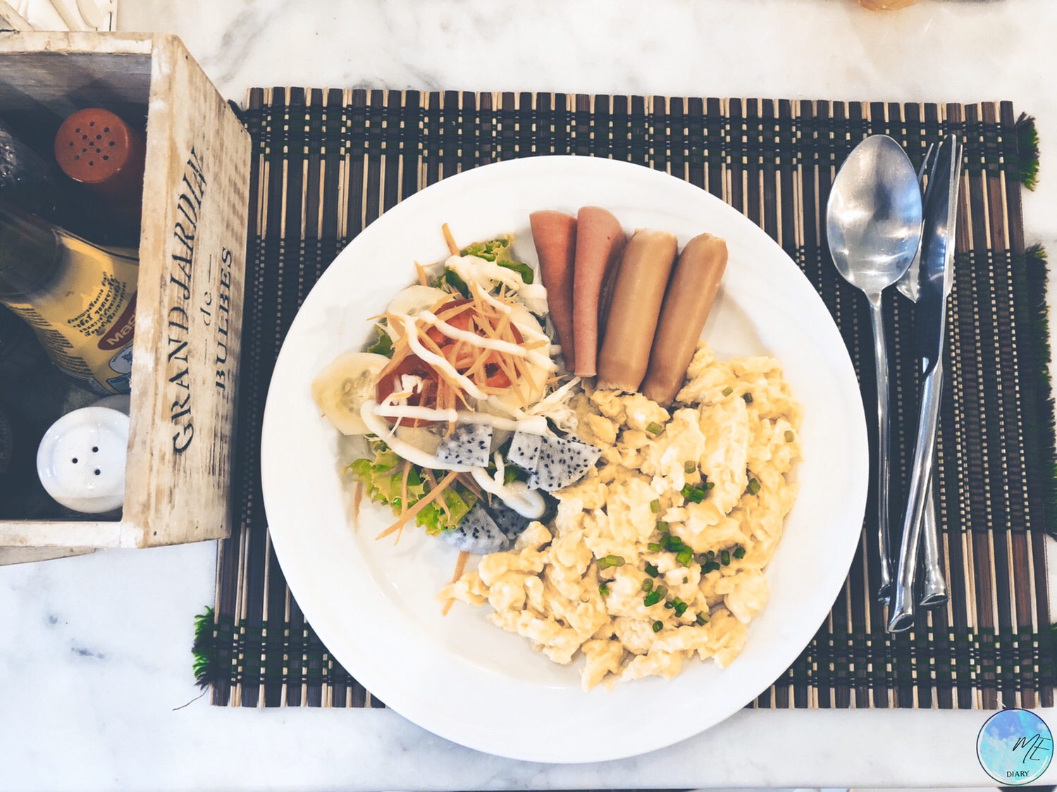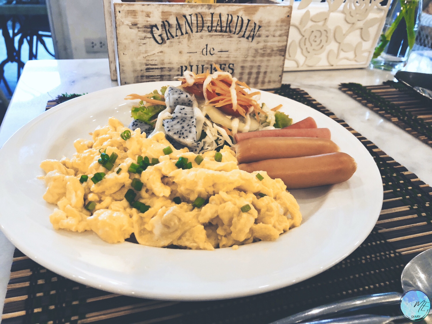 จานนี้ไข่คน หรือscrambled eggs มีสลัด แฮม ไส้กรอกให้นิดหน่อย จานนี้แนวจืดๆ แต่ก็อร่อยดี ⭐️ให้ 4.5 ดาว⭐️