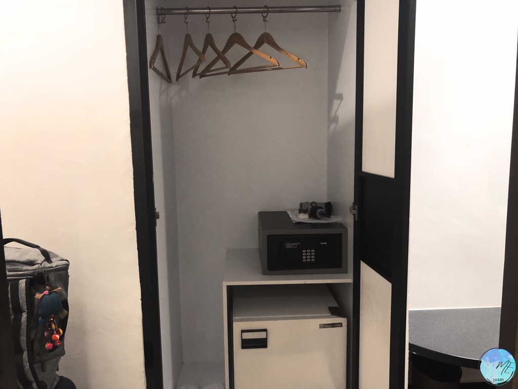 ในตู้เสื้อผ้ามีตู้ล็อคนิรภัย และตู้เย็นขนาดเล็ก