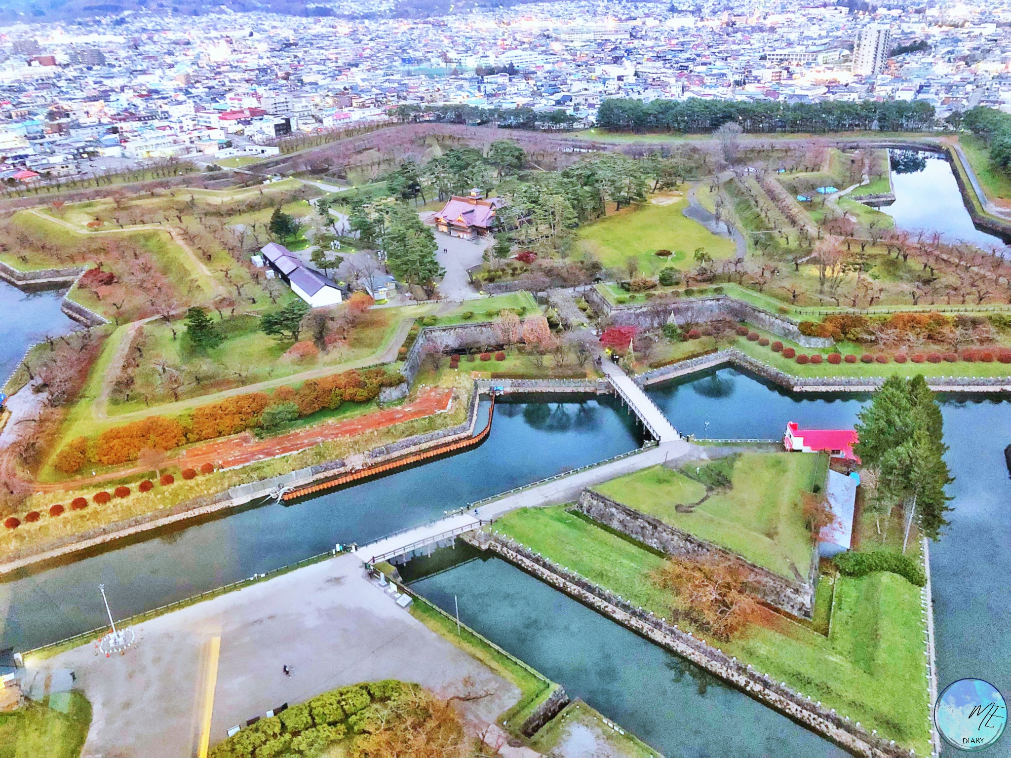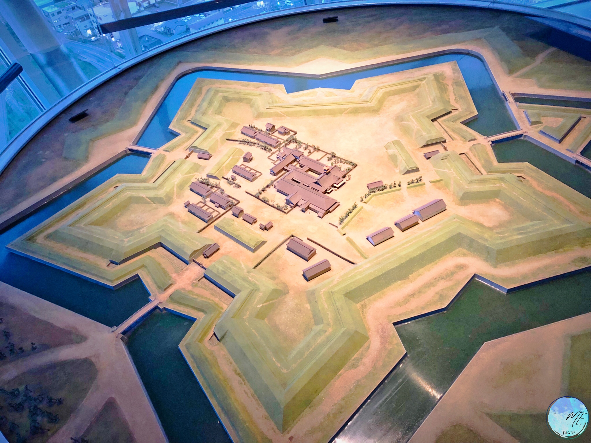 ภายในนั้นจะมีจุดที่น่าแวะอยู่หลายจุดด้วยกัน ไม่ว่าจะเป็นจุดแรกอย่างพื้นที่รูปดาว โดยสะพานข้ามเข้าไปในพื้นที่รูปดาวเปิดตั้งแต่เวลา 9:00-19:00 น. บริเวณนี้ถือว่ามีความสำคัญมากๆในอดีตเลยนะคะ เนื่องจากใจกลางพื้นที่รูปดาว สมัยก่อนนั้นเคยเป็นที่ทำการรัฐบาลของฝ่ายสาธารณรัฐ(Former Magistrate Office) ของเจ้าหน้าที่ผู้สำเร็จราชการบริหารฮอกไกโด โดยนับว่าเป็นศูนย์กลางการปกครองภาคเหนือในสมัยของรัฐบาลโชกุน อาคารดั้งเดิมได้ถูกทำลายหลังจากการล่มสลายของรัฐบาลโชกุนเอโดะในปี ค.ศ. 1871 และได้รับการบูรณะซ่อมแซมใหม่ แต่เนื่องจากอาคารเดิมได้ถูกทำลายไปเกือบหมดสิ้น ทำให้ยากในการที่จะบูรณะอาคารทั้งหมดให้กลับมาสู่สภาพเดิม จึงมีการนำภาพถ่ายในอดีตและเอกสารอ้างอิงต่างๆมาวิเคราะห์และก่อสร้างสำนักงานปกครองฮาโกดาเตะขึ้นให้ใกล้เคียงสภาพเดิมมากที่สุด และเริ่มเปิดให้ประชาชนได้เข้าชมในปี ค.ศ.2010