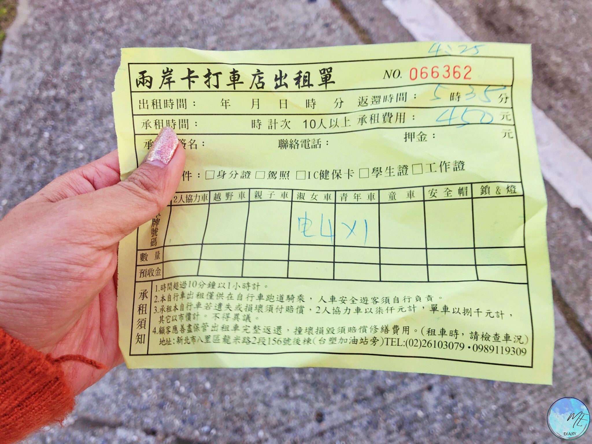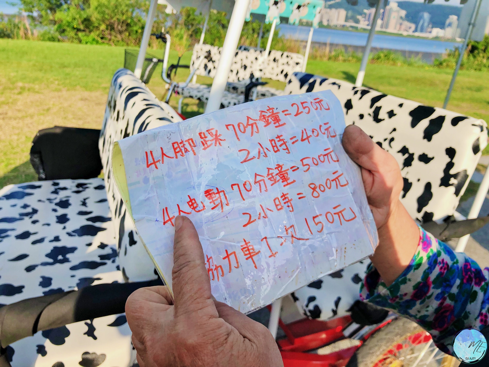 4 คน จักรยานธรรมดา 70 นาที 250 NT ถ้าจักรยานไฟฟ้า 500 NT แนะนำว่า ถ้าจะปั่นด้วยกันเลือกจักรยานไฟฟ้าดีที่สุด เพราะทางมีเนินเยอะเหมือนกัน ถ้าปั่นเองอาจจะต้องมีจูง