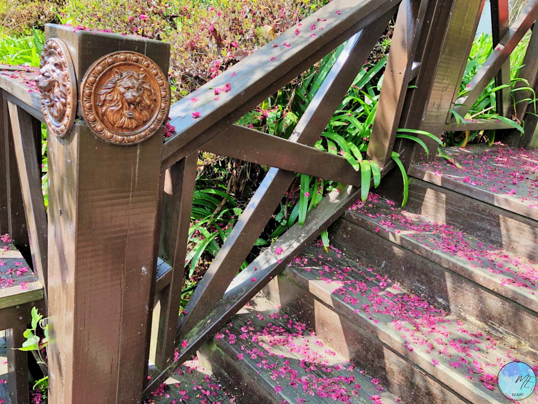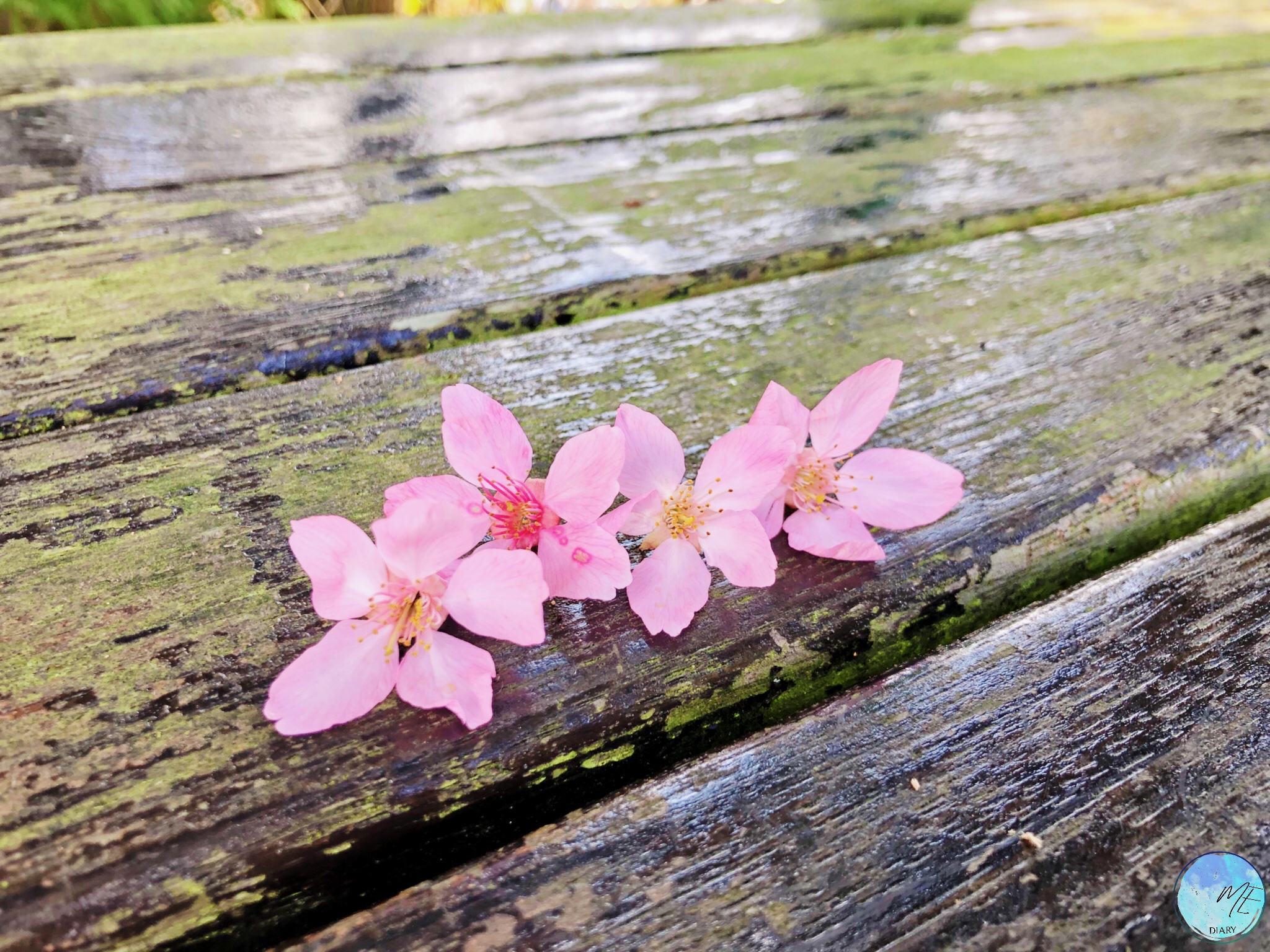 ดอกซากุระร่วงลงมาที่บันไดสงสัยเพราะเมื่อคืนฝนตกหนักมากแน่ๆ