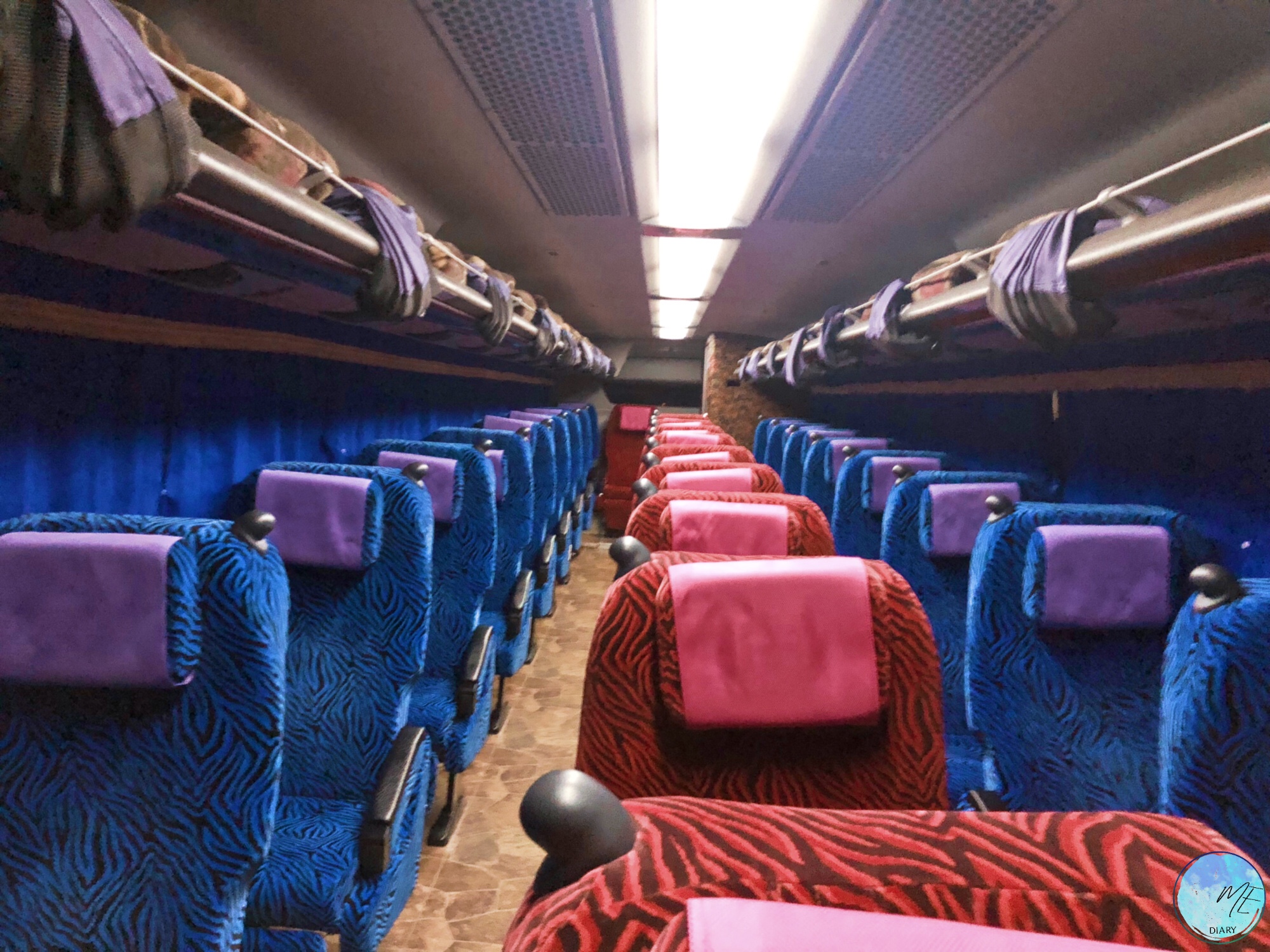 ภายในรถบัสแต่ละแถวจะมี 3 ที่นั่งแยกกัน สามารถดึงผ้าม่านมาปิดเพิ่มความเป็นส่วนตัวขึ้นได้ เบาะเอนได้ไม่มากเหมือนบ้านเรา