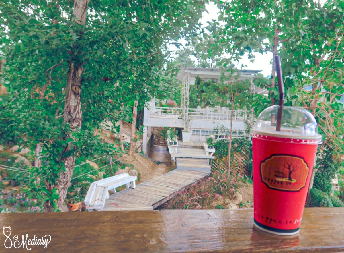 เดินไปถ่ายรูปจนลืมกาแฟเลยอ่ะ 555 กลับมาเอากาแฟที่ร้านก่อนที่มันจะละลายหมด ในตอนนั้นฝนก็ตกปลอยๆ อากาศดีมากๆๆ มองไปด้านนอกชายคาร้านกาแฟเห็นภูเขาสีเขียวๆ เจือด้วยหมอกจางๆ สวยดี