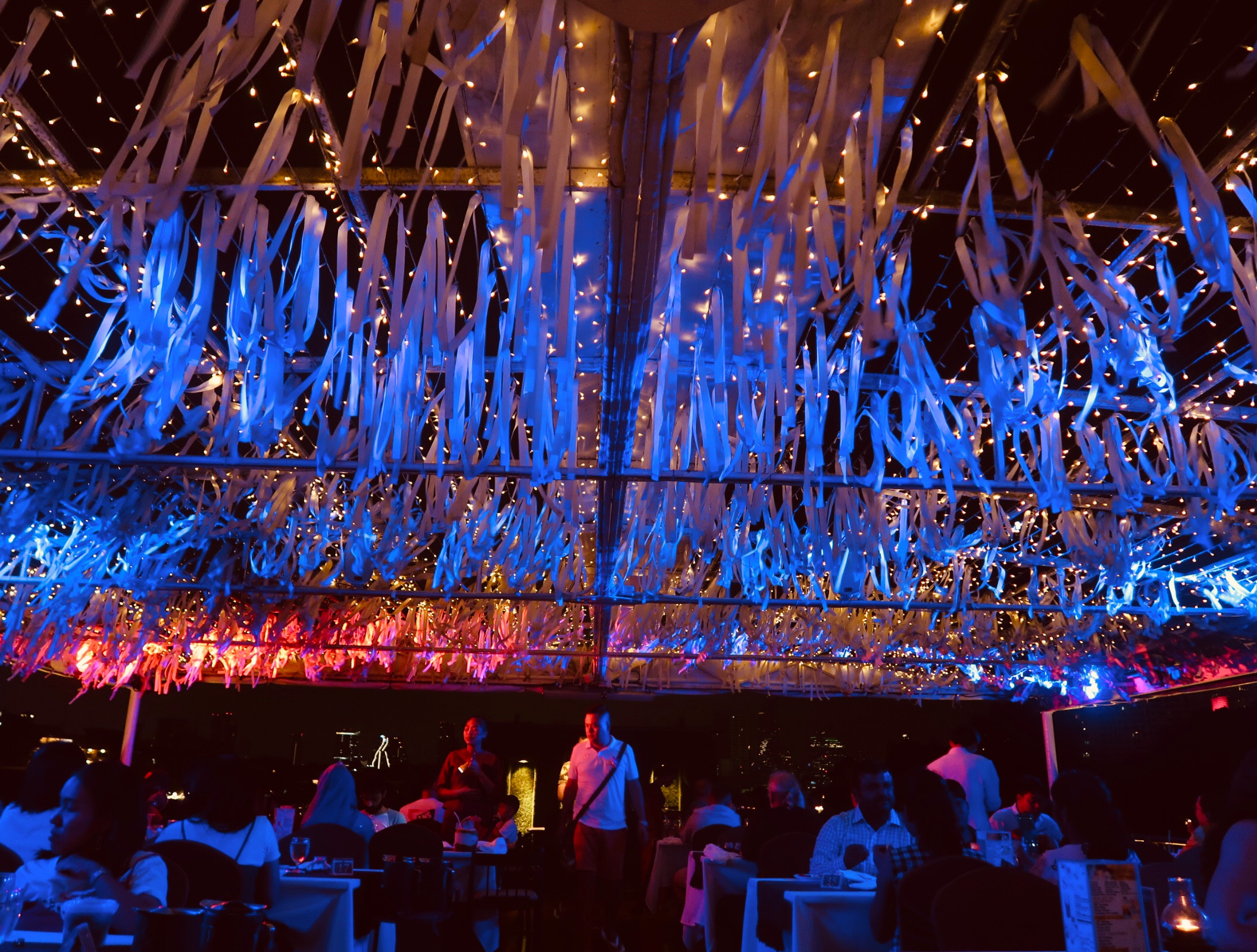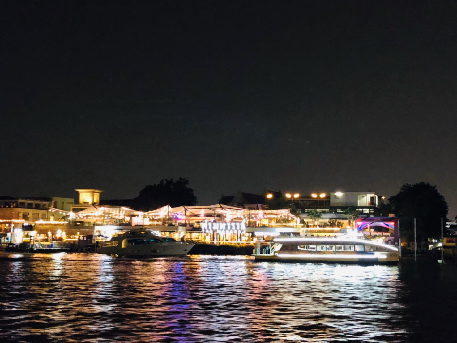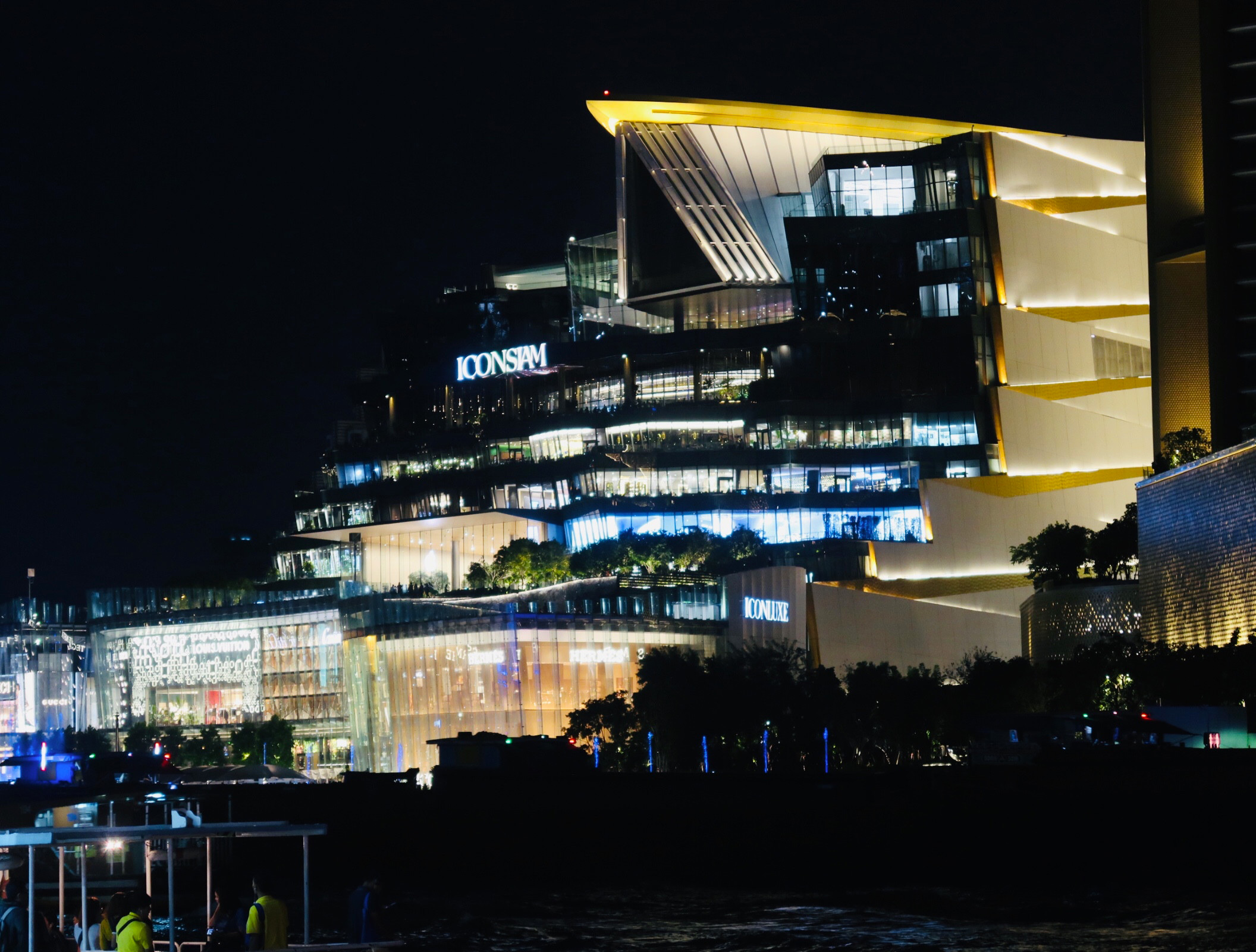แปปเดียวกลับออกมาด้านนอกแสงอาทิตย์ก็ลับขอบฟ้าไปแล้วกลายเป็นแสงไฟนีออนที่ส่องสว่างแทน ได้ความรู้สึก nightlife ของกรุงเทพดี มองออกไปยังฝั่งตรงข้าม นั่นก็คือห้างเปิดใหม่ ICON Siam ซึ่งจริงๆ มันก็ไม่ใหม่แล้วนะ แต่เราก็ยังไม่เคยไปเลยสักครั้ง (นางเพื่อนต่างชาติคงไม่ตามมาถามอีกนะว่าคุณเคยไปมั้ย><)