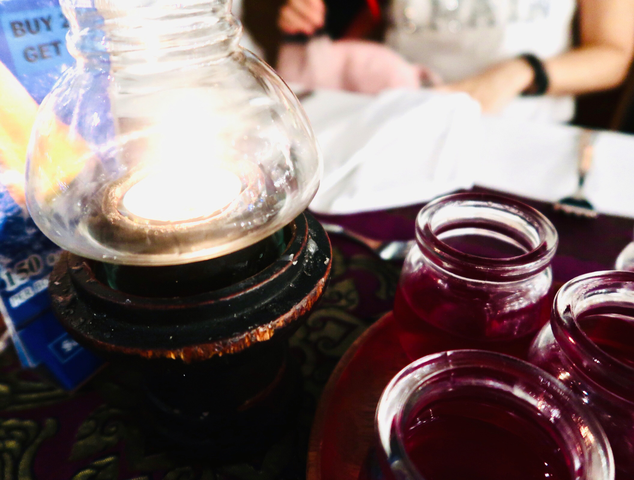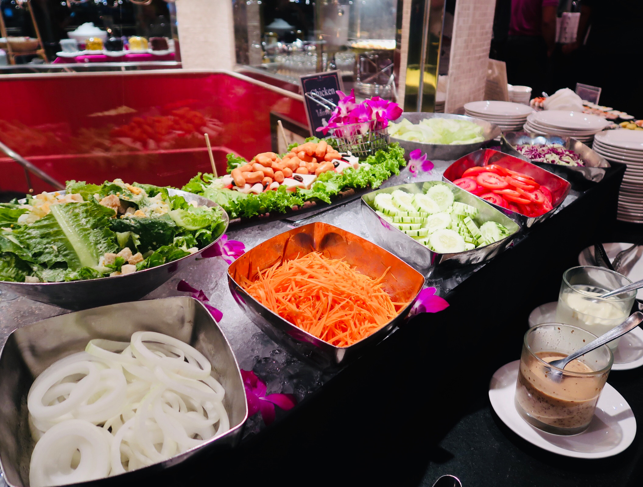 เสริฟด้วย welcome drink เป็นน้ำกระเจี๊ยบสีแดงเข้มรสเปรี้ยวจี๊ดถึงใจ ตามมาด้วยพนักงานเสริฟที่เข้ามาสอบถามว่าอยากได้น้ำอะไรเป็นพิเศษ พวกน้ำอัดลมนั้นรวมในราคาบัตรเรียบร้อยแล้ว แต่ถ้าเป็นแอลกอฮอล์สามารถจ่ายเพิ่มได้ ราคาเบียร์ขวดเล็กก็อยู่ที่ประมาณ 130 – 150 บาท