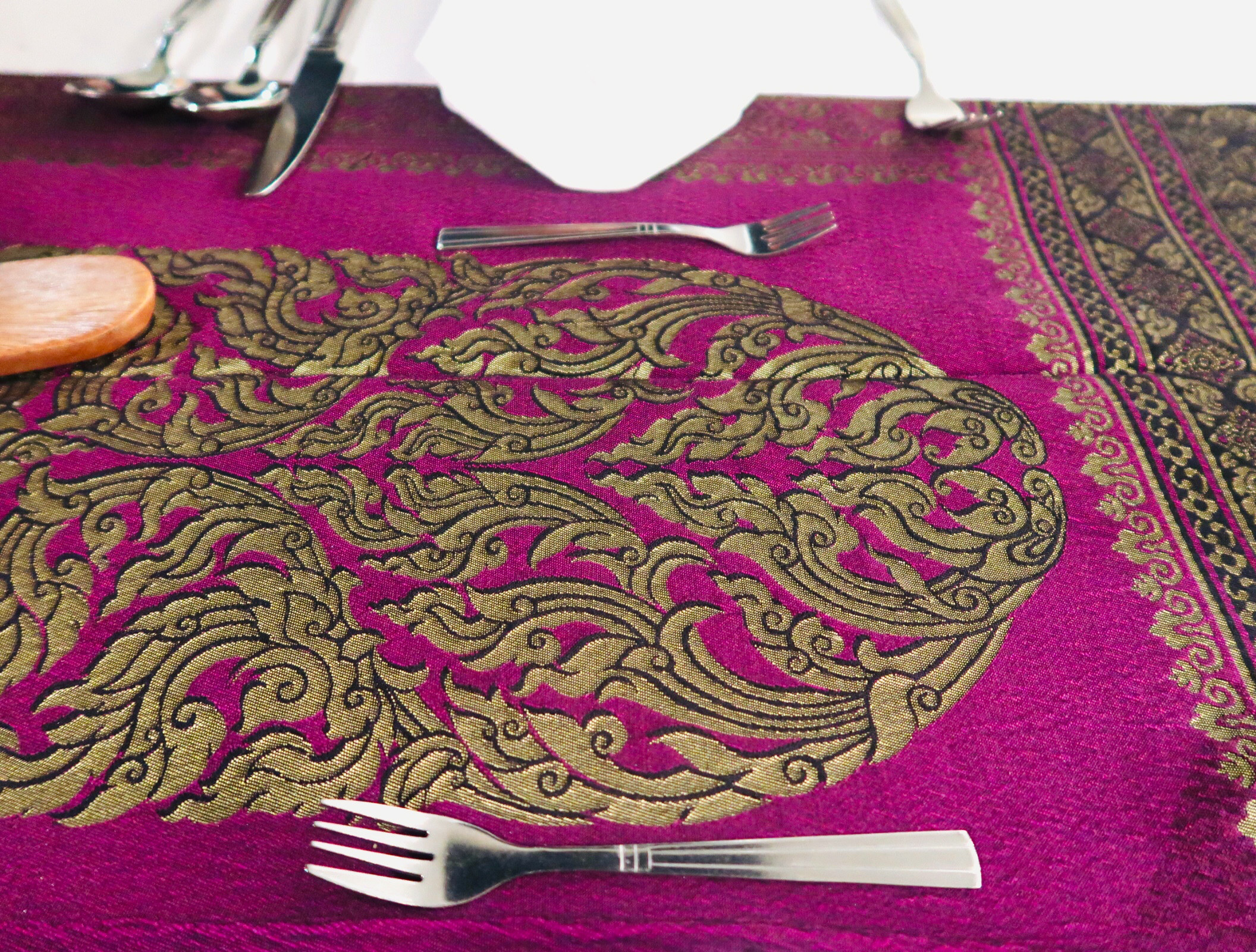 ในที่สุดเราก็ได้ขึ้นมาบนเรือแล้ว ผ้าปูโต๊ะสีชมพูบานเย็นสกรีนด้วยลายไทยสีทองสะท้อนความเป็นไทยได้เป็นอย่างดีถูกวางอย่างเป็นระเบียบด้วยช้อนส้อมมีดและที่เช็ดปากสวยงามและดูดีเลยทีเดียว