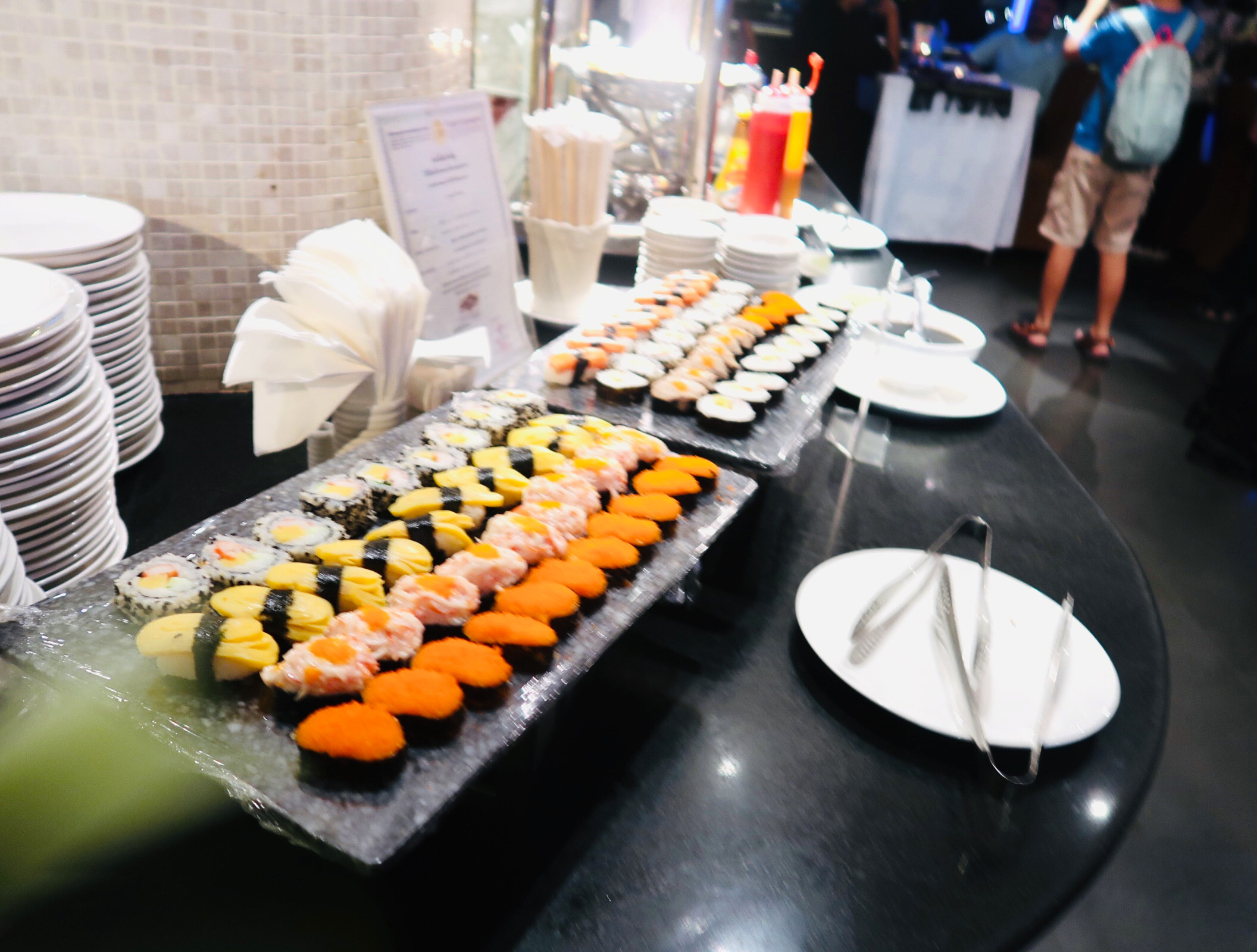 อาหารเค้ามีอยู่ 2 ชั้นของเรือเลยนะ อาหารญี่ปุ่นนี่มีพวกซูชิ ซาชิมิแซลม่อน ปูอัด ส่วนอาหารทะเลก็มีกุ้งนึ่ง