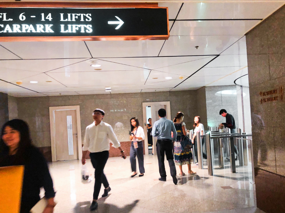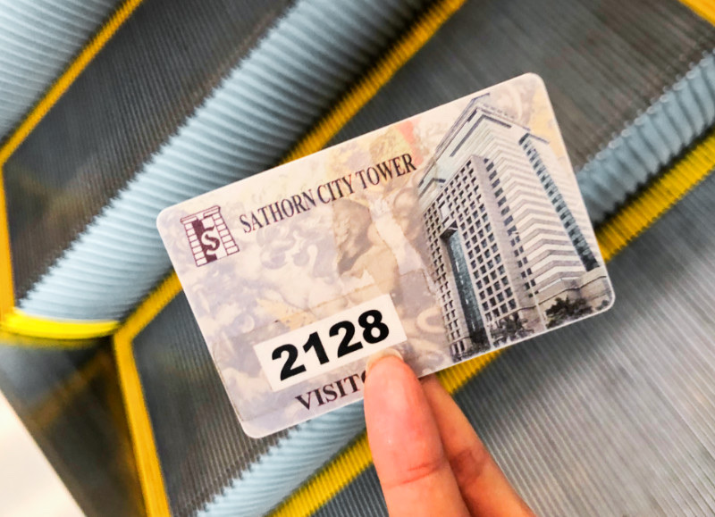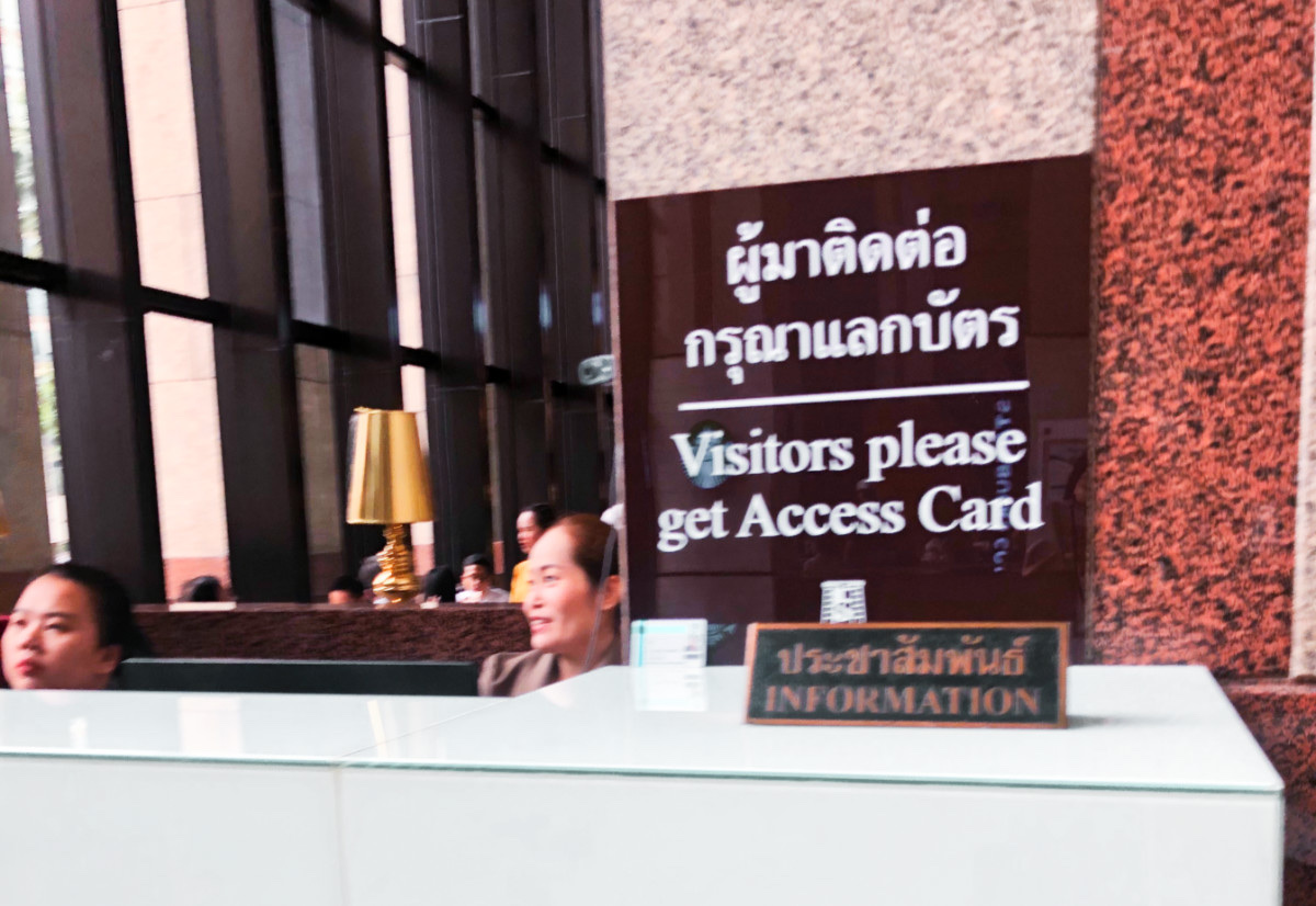 เปิดประตูเข้ามาในตึกแล้วก็เดินมาที่ประชาสัมพันธ์ก่อนเลย เอาบัตรประชาชนให้เจ้าหน้าที่เค้า แล้วเค้าจะให้บัตรแสกนผ่านเข้า-ออกประตูมาให้พร้อมคืนบัตรประชาชนให้เราด้วย