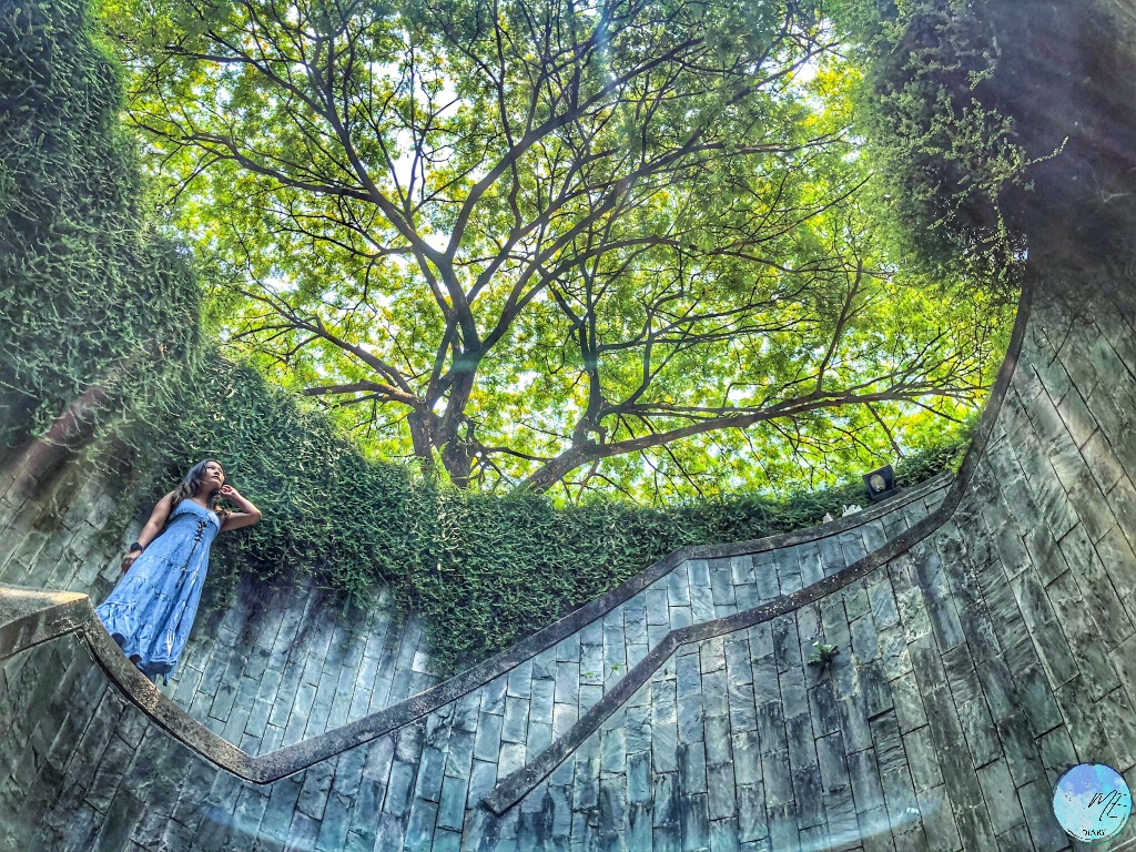 พอเดินขึ้นมาด้านบนก็เห็นวงกลมที่ล้อมรอบไปด้วยต้นไม้จนกลายเป็นอุโมงค์ต้นไม้จากด้านล่างที่เราเห็น
