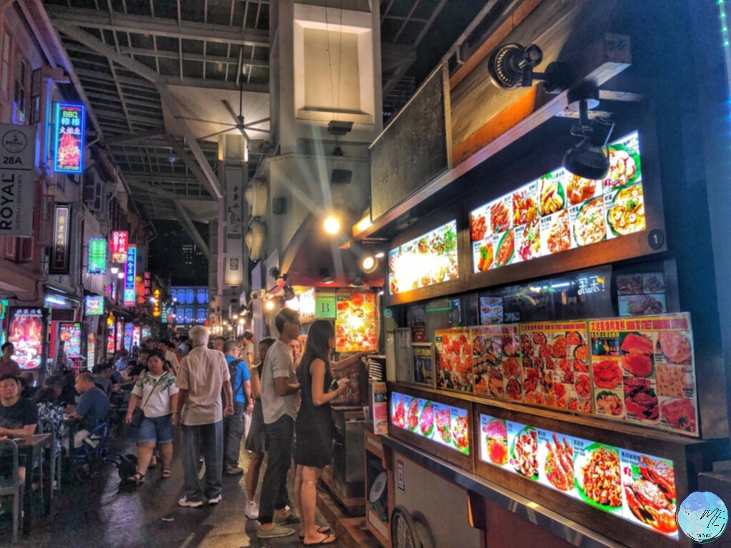เราเดินมาบริเวณเค้าเรียกกันว่า Chinatown Food Street โอ้โห ซอยนี้ก็ปิดถนนตั้งโต๊ะกันกลางถนนเลย และก็มีแต่อาหารน่ากินเต็มไปโม้ดด สะเต๊ะ ก๋วยเตี๋ยว ข้าวหมูแดง ข้าวหมูกรอบ หอยทอด ปู กุ้ง จะนั่งร้านอาหารข้างทางก็มี หรือแบบรถเข็นให้ซื้อใส่ถุงเดินกินไปก็ได้ ราคาอาหารก็ไม่แพงนะ ประมาณ 5-20 เหรียญเท่านั้น