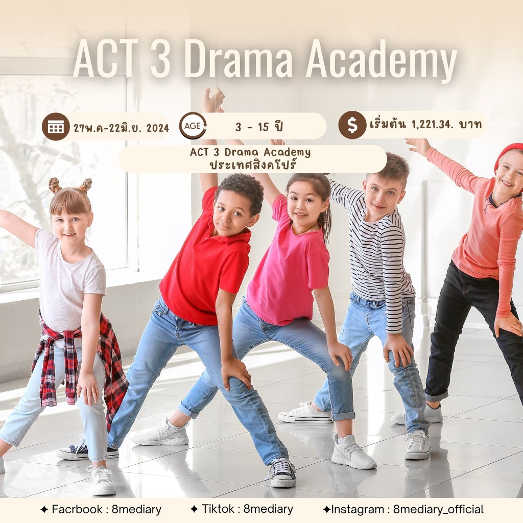 ACT 3 Drama Academy ขอเชิญชวนเด็กๆอายุ 3 ปี ถึง 15 ปี มาสนุกและเรียนการแสดงผ่านเพลง โดยการเคลื่อนไหว และการเล่นจินตนาการ เด็กอายุ 4 ถึง 7 ปีจะได้เรียนรู้การพัฒนาตัวละครและการสร้างเรื่องราว ส่วนเด็กอายุ 8 ถึง 10 ปีจะได้ค้นพบความลับในการนำเสนอตัวละคร สำหรับเด็กอายุ 3 ถึง 15 ปี มีการเรียนการสอนเป็นเวลา 1 สัปดาห์ ที่มุ่งเน้นการเล่าเรื่อง การพัฒนาตัวละคร และการทำงานเป็นทีม ปิดท้ายด้วยการแสดงที่สนุกสนานสำหรับเพื่อนและครอบครัว